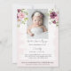 Envie a foto do bebê e os detalhes dos marcos importantes no verso, e envie convites que duplamente servirão como lembranças! Dê um estilo ao primeiro aniversário da sua bebê com detalhes florais em aquarela elegantes! Vibrações minimalistas modernas em preto e branco com um toque de sutil rosa. Este design versátil combina bem com temas de chá de bebê, festa no jardim, boho e shabby chic.