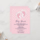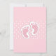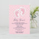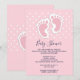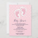 Convite de chá de bebê com uma imagem adorável de pegadas de bebê menina rosa com um contorno branco grosso e bolinhas brancas em um fundo rosa atrás da ilustração.