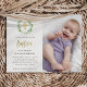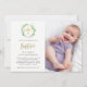 Este elegante convite de batismo botânico apresenta uma coroa verde de folhas cercando uma cruz dourada falsa, sobre um fundo branco limpo. Adicione a foto do seu bebê. Usamos arte da LABFcreations.