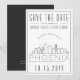 Um convite de casamento único para salvar a data, para um casamento que acontecerá na bela cidade de Phoenix, Arizona. Este convite apresenta uma ilustração estilizada da linha do horizonte única da cidade com seu nome abaixo. Isto é seguido pelas informações do seu dia de casamento em um estilo aberto e alinhado correspondente. No verso do convite há uma cor cinza escuro para complementar a aparência e a sensação. Todos os elementos individuais do cartão de convite são desbloqueados para que você possa alterar quaisquer detalhes necessários, como tamanhos de fonte, estilos e muito mais, usando a função de personalização. Você pode adicionar uma foto no verso e aplicar um filtro preto e branco a ela. Divirta-se sendo criativo e tornando-o seu!