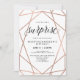 Estes convites de festas na moda surpresa apresentam um padrão geométrico falsa de ouro rosa sobre fundo branco, com tipografia negra moderna.