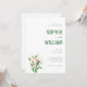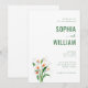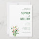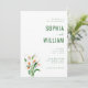 Este convite de casamento elegante apresenta um layout limpo e minimalista com amplo espaço em branco, criando uma atmosfera sofisticada e serena. O design exibe letras serifadas verdes grandes e ousadas para os nomes, complementadas por uma delicada ilustração de copos-brancos à esquerda, adicionando um toque de elegância natural. A tipografia é refinada, usando fontes serifadas maiúsculas para detalhes importantes, enquanto a paleta de cores de verdes suaves e brancos realça o tom formal e convidativo. Perfeito para casais que buscam uma estética clássica e moderna, este convite prepara o cenário para uma celebração memorável.