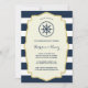 Este convite de festa de aniversário náutico chic apresenta listras ousadas azuis marinho e branco, uma borda de folha de ouro falsa, caligrafia bonita e um leme de navio. Altere o texto para se adequar a qualquer aniversário.
