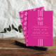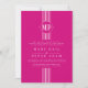 Listras brancas e iniciais magenta, convite de casamento rosa. Ele exibe faixas brancas verticais no centro com um círculo com suas iniciais e dois pequenos corações e seu texto. O verso inclui um padrão feito de suas iniciais em cor magenta.