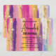 Convite de aniversário com um design de fundo abstrato. Listras vibrantes em cores fortes e pastéis. Cores rosa, azul, roxo e amarelo combinadas com brilho dourado falso em camadas por cima.