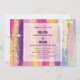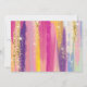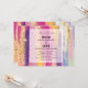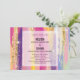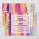 Convite de casamento com um design de fundo abstrato. Listras vibrantes em cores fortes e pastéis. Cores rosa, azul, roxo e amarelo combinadas com brilho dourado falso em camadas sobrepostas.
