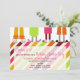 Um convite de festas do descanso do aniversário que caracteriza uma ilustração de quatro pares de pés que vestem o flamingo, o urso, o gato, e os deslizadores do coelho. Os pijamas têm o esquema de cores brilhante. O fundo é listrado. Personalize o texto.