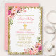 O moderno Elegante Watercolor Pink Blush Floral Primeiro Sagrado Convite à Comunhão inclui rosas cor-de-rosa e verde. Dourado quadro de brilho. Dourada Cruz.
