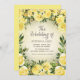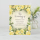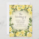 Rosas amarelas/aquarela floral e folhagem com brilho de ouro brilhante, convite de casamento botânico com texto, "O casamento de" escrito em uma elegante letra manuscrita.