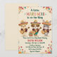 This charming baby shower invitation design features the phrase, "A Little Mariachi is on the Way" and three adorable animals (a llama, a donkey, and a puppy) wearing colorful sombreros and playing guitars.