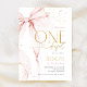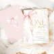 Little miss ONEderful pink bow 1st birthday invitation. Modern feminine design in blush pink and gold. Features trendy watercolor coquette bow, and heart script font. Perfect for an elegant style girl's first bday celebration. Personalize with your own details. Printed Zazzle invitations or instant download digital printable template.