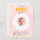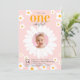 Um belo e moderno convite para o aniversário de flores de fotos da Miss Onemagia. O primeiro convite de aniversário da Srta. Onelinda, com a foto do seu filho e o centro, enquadrados por pétalas de flores. As flores que combinam mais lindas se espalham pela foto. Voltar deixa espaço para uma mensagem pessoal, se quiser. Boho retro flores brancas e amarelas. Divertido. Um convite de aniversário elegante para chic e uma coleção de festas.