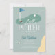 This retro modern "a little putter on the way" boy's baby shower invitation features a blue flag and golf balls with a fairway and bunker in a golf course. The reverse side features a light blue background with a golf ball and tee pattern. Personalize it for your needs. You can find matching products at my store.