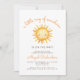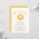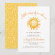 This cute baby shower invitation features a watercolor illustration of a sun with a smiling face. Above, the words "a little ray of sunshine" appear in trendy orange handwriting script. Personalize the text with the name of the mom-to-be in orange script and the details in brown sans serif font. The back of the card features a pattern of white hand-drawn stars on a yellow background. Ideal for a boy's or girl's baby shower.