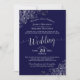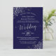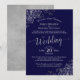 Tempos desesperados exigem medidas desesperadas! Devido à atual emergência de saúde pública, casais estão encontrando formas criativas de celebrar seus casamentos. Este belo convite convidará seus convidados a comparecer virtualmente a um livestream do seu casamento. Ele apresenta um design simples, mas elegante, com a caligrafia de cinza antiga em um fundo azul marinho e um filigre de folha fina de cinza prateada nos cantos. Porque o amor persiste!
