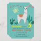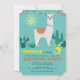 Um Convite de aniversário colorido com uma lhama engraçada em fundo de fiesta e cactos.