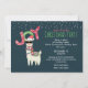 Um convite de festas de natal com um design caprichoso. Uma lhama bonita vestindo óculos escuros, um chapéu de Papai Noel vermelho e um cachecol festivo de inverno. Também vestindo um cobertor e pom-poms da América do Sul. A palavra Joy escrita sobre sua cabeça em uma fonte festiva colorida. Neve caindo do topo. Colocado sobre um fundo azul escuro.