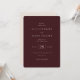This elegant wedding invitation features a sophisticated maroon background with clean, modern typography that exudes timeless charm. The minimalist design focuses on the text, creating an understated yet refined look perfect for a classic celebration. With its simple and graceful layout, it sets a mood of warmth and sophistication, making it ideal for couples who appreciate elegance in their special moments. Customize this design to personalize your big day, ensuring every detail reflects your unique style.