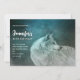 Convite de aniversário com uma fotografia de um lindo lobo peludo peludo cinza. Ao fundo está uma floresta escura com árvores. Mística mágica.