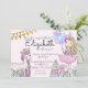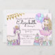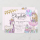 Tenham uma celebração mágica com este espantoso ouro brilhante e um convite de aniversário de unicórnio para meninas cor-de-rosa. Possui uma menina loira segurando balões e cercada por bolo e presentes com sotaques dourados. Do outro lado está o bunting dourado, um unicórnio e mais presentes. Totalmente personalizado para qualquer celebração que você precise! O fundo é um rosa macio muito leve. É uma maneira tão divertida de celebrar um aniversário de unicott encantador! Clipart de MashaStudios.