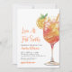 Love At First Spritz Bridal Shower Invitation. Celebrate the bride to be with this charming and cheerful design, perfect for a bridal shower with a citrus cocktail theme. The front features a delightful watercolor Aperol Spritz inspired cocktail in hues of red, pink, and orange, accented by vibrant green leaves and a striped straw, creating a fresh and playful look.