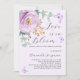 Um fundo de cor lilás macio. Decorados com um rosa lilás, roxo e eucalipto verde e borboletas, de cor aquosa. Personalize e adicione seu nome e detalhes da festa. Texto: O amor está em Bloom.