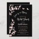 This elegant blush pink and black bridal shower invitation showcases the saying 'Love is in bloom,' adorned with beautiful blush pink cherry blossoms and two butterflies on a black background. The backside includes a QR code for the person of honor's gift registry.