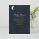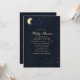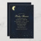 A Lua Celestial Estende O Convite À Chá de fraldas Azul À Meia-Noite. Este design apresenta luzes estreladas brilhantes com uma lua crescente brilhando no céu noturno estrelado.