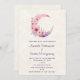 Um convite para o casamento com uma ilustração adorável que apresenta uma lua rosa e púrpura da lua. Bonito flores silvestres cor-de-rosa e amarelas adornam este corpo celeste.