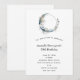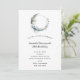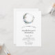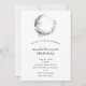 Um convite de aniversário com uma ilustração mística. Uma lua crescente azul escura com um contorno circular fino e elegante e flores brancas desabrochando ao longo de suas bordas.