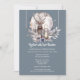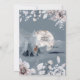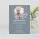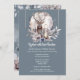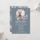 Um na moda e um design elegante sobre um fundo azul-carvão-dusky que apresenta a cabeça e os galhos de uma majestosa estaca espreitando sobre o topo da folhagem do outono e bagas que tem uma lanterna sobre ela. O veado está em frente a uma lua de cheio de aquarela e o fundo escuro faz a cena noturna pop. A frente tem um bosque à noite, com uma lua de cheio e um saco solteiro à distância enquadrados por folhas de folhagem cor-de-rosa macia e azul-céu. A lua tem modelos mostrando os nomes dos casais que podem ser personalizados. Se você se casar no inverno, tenha uma terra maravilhosa de inverno, queda rústica | Casamento no outono ou no tema florestal, esta ilustração é perfeita para as suas necessidades.