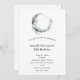 Um convite de aniversário com uma ilustração mística. Uma lua azul escura com um contorno fino elegante e flores brancas ao longo das suas bordas.