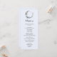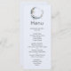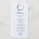Menu Evento com uma ilustração mística. Uma lua azul escura com um contorno fino elegante e flores brancas ao longo das suas bordas.