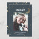 Este simples e fofo convite para a festa de formatura mostra sua foto e um fundo azul/azul-marinho da meia-noite com a lua e as estrelas da lua brilhantes douradas. O verso apresenta um fundo azul da meia-noite / azul marinho com lâminas de folha de ouro falsas. Personalize-o para as suas necessidades. Você pode encontrar produtos correspondentes na minha loja.