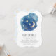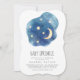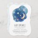 Esta lua e as estrelas, o convite para bebês, é perfeito para um simples chá de fraldas. A design branca moderna apresenta uma forma de nuvem azul-aquática marinho com uma lua e estrelas amarelas com um quarto de lua amarela.