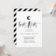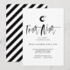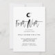 Anuncie a sua festa do Dia das Bruxas e convide os seus convidados com o nosso design de convite para as festas do Dia das Bruxas moderno e na moda. A design apresenta uma lua negra e branca e estrelas desenhadas em um estilo minimalista simples. A "Noite Incerta" é exibida em uma tipografia de estilo de script de escova de na moda e tendência, a preto, com os detalhes dos eventos exibidos em um layout simples para criar um design de convite para as festas modernas e modernas de halloween. O verso apresenta um design de faixa diagonal moderna, preto e branco. Você pode personalizar o tamanho do texto, a cor do texto, a fonte e o layout para sua preferência de design pessoal.