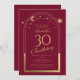 A Celestial Red Dourada Sun Moon Astronomy aniversário de 30 anos Invices apresenta um elegante sol dourado, lua e estrelas com um quadro de ouro sobre fundo vermelho. Dentro é a sua informação de convite de 30 anos. Personalize editando o texto nas caixas de texto. Projetado para você pelo Evco Studio www.zazzle.com/store/evcostudio