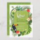 Convite de festas divertida de luau (também conhecido como LuWOW) com um gancho de pera e uma borda com um tucano ousado sentado entre flores de hibisco e folhas de palma. O reverso tem um padrão repetitivo de folha de palma em tons de primavera verde. Adicione os detalhes do evento usando o modelo fornecido. São perfeitas para o verão e/ou eventos especiais tropicais como aniversários, festas de piscina e festas de formando. Procure ID577 para ver os produtos correspondentes.