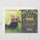 [Todo o texto é editável, exceto Lucky ONE] Convite de aniversário bonito no estilo. Tema: Shamrock Dia de São Patrício. Primeiro Aniversário. Estilo: bonito, fofo, elegante. Cores: verde, branco, ouro, cinzas de carvão. Gráficos: Shamrock, chapéu verde, ouro falso.