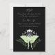 Uma mariposa verde vibrante é cercada por fases na lua e lama folhas verdes em um fundo preto profundo.