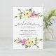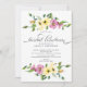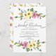 Lindo convite para almoços nojentos, amarelo e violeta, com uma letra de script escrita à mão e coordenando as costas florais.