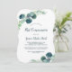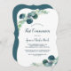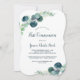 Este exuberante verde e eucalipto primeiro convite de comunhão é perfeito para um evento elegante no quintal. O design botânico moderno apresenta um belo eucalipto azul-aquarela e folhas verdes.