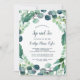 Este exuberante verde e eucalipto e o convite é perfeito para um belo quintal conhecer a festa do bebê. O design botânico moderno apresenta um belo eucalipto azul-aquarela e folhas verdes.