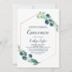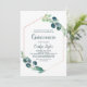 Este convite de Quinceañera, geométrico rosa de ouro verde e verde, é perfeito para uma festa de aniversário de 15 elegante. O design botânico moderno apresenta um belo eucalipto azul-aquarela e folhas verdes.