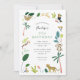 Convite de festas Whimsical que apresenta a exuberante vida vegetal da selva e ilustrações animais, incluindo tigre, papagaio, preguiça, macaco e cobra.