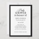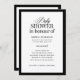 Estes elegantes e velhos convites para chuveiros de bebês têm uma dramática fronteira preta e um design de texto preto e branco. Há uma mistura de texto negro clássico e caligrafia moderna para uma design clássica e minimalista perfeita para seu eterno, chá formal. A ortografia "em honra" é correta para inglês britânico, canadense, neozelandês e australiano (há outra versão com a ortografia inglesa americana aqui no meu compro).