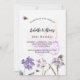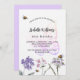 Um fundo branco na frente. Decorados com abelhas e pintados de flores silvestres em violeta, rosa e uma borboleta grande. Personalize e adicione um nome e detalhes da parte. Fundo: fundo violeta.