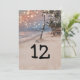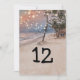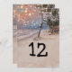 Vintage Beach Destina números de mesa de casamento apresentando um cenário romântico de praia tropical com o pôr do sol com palmeiras exuberantes, lanternas e um modelo de número de mesa que é fácil de personalizar.