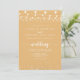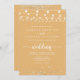 Esta corda amarela ilumina as estrelas à frente e atrás do convite de casamento é perfeito para um casamento rústico. A design apresenta belas luzes de cordas pintadas manualmente com estrelas esplêndidas em um fundo amarelo. Salve o papel, incluindo mais detalhes na parte traseira do convite em vez de em uma placa de gabinete separada.