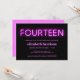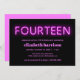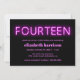 convite de aniversário moderno legal com "FOURTEEN" em luzes néon cor-de-rosa-quente contra um fundo preto.